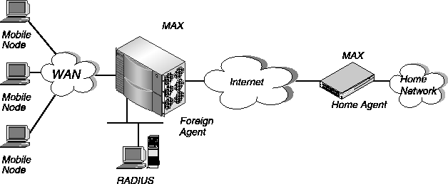 You can configure the MAX to act as a home agent or a foreign agent on a tunnel-by-tunnel basis. A typical network topology appears in Figure 7-4.